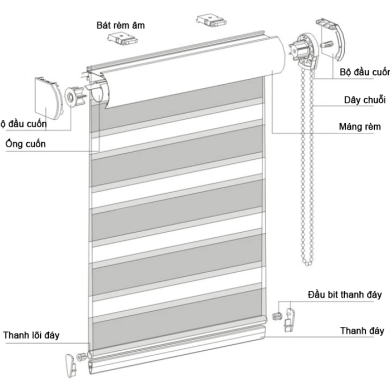 Hộp phụ kiện, thanh đáy rèm được làm bằng hợp kim nhôm sơn tính điện với độ bền lên đến hơn 15 năm. Hộp phụ kiện và thanh đáy có màu đồng nhất.